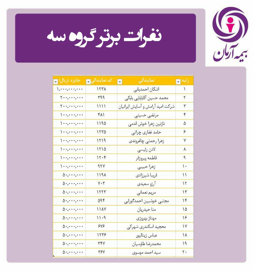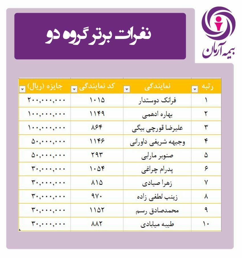 اجرای کمپین های فروش برای نمایندگان ، اهدا جوایز و تسهیلات به نمایندگان از جمله برنامه های ویژه بیمه آرمان در سال 99 می باشد. نفرات برتر جشنواره فروش دوماهه آخر سال در سه گروه بدین شرح اعلام می گردند: