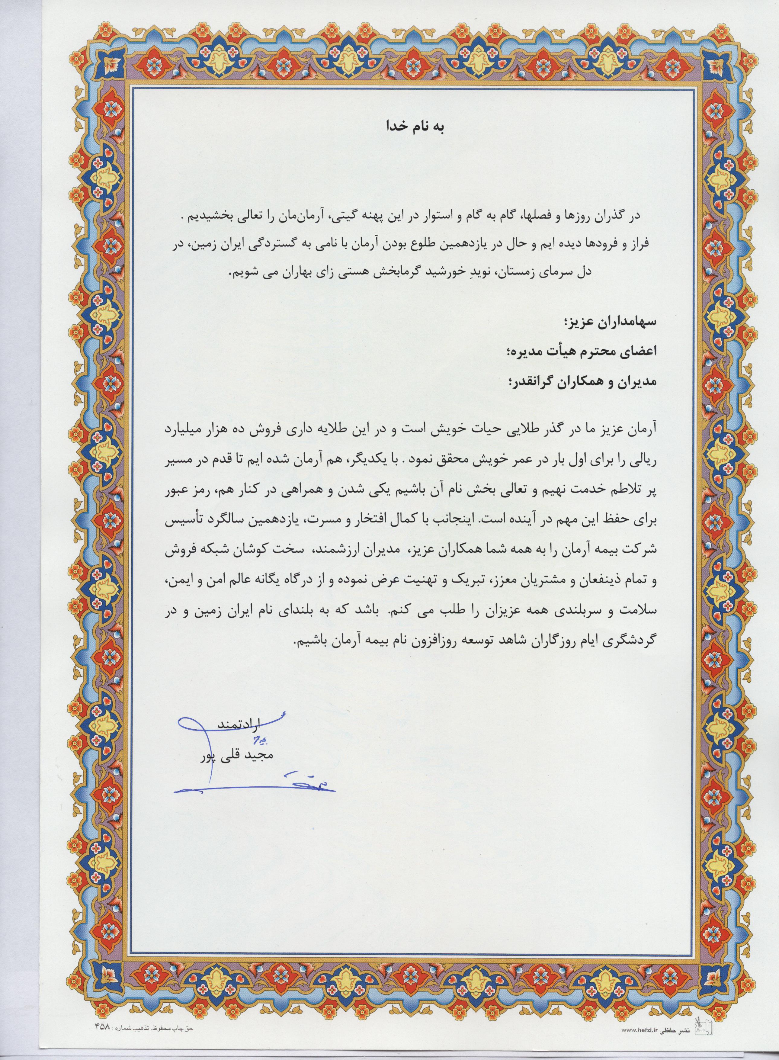 در گذران روزها و فصلها، گام به گام و استوار در این پهنه گیتی، آرمان مان را تعالی بخشیدیم. فراز و فرودها دیده ایم و حال در یازدهمین طلوع بودن آرمان با نامی به گستردگی ایران زمین، در دل سرمای زمستان، نویدِ خورشید گرمابخش هستی زای بهاران می شویم. سهامداران عزیز؛ اعضای محترم هیأت مدیره؛ مدیران و همکاران گرانقدر؛ آرمان عزیز ما در گذر طلایی حیات خویش است و در این طلایه داری فروش ده هزار میلیارد ریالی را برای اول بار در عمر خویش محقق نمود . با یکدیگر، هم آرمان شده ایم تا قدم در مسیر پر تلاطم خدمت نهیم و تعالی بخش نام آن باشیم یکی شدن و همراهی در کنار هم، رمز عبور برای حفظ این مهم در آینده است. اینجانب با کمال افتخار و مسرت، یازدهمین سالگرد تأسیس شرکت بیمه آرمان را به همه شما همکاران عزیز، مدیران ارزشمند،  سخت کوشان شبکه فروش و تمام ذینفعان و مشتریان معزز، تبریک و تهنیت عرض نموده و از درگاه یگانه عالم امن و ایمن، سلامت و سربلندی همه عزیزان را طلب می کنم.