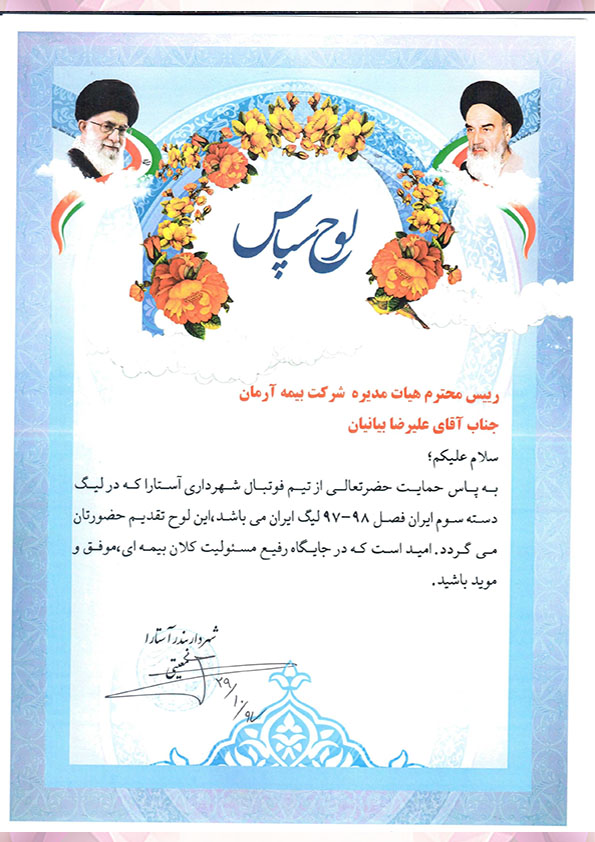 تقدیرنامه به پاس حمایت از تیم فوتبال آستارا