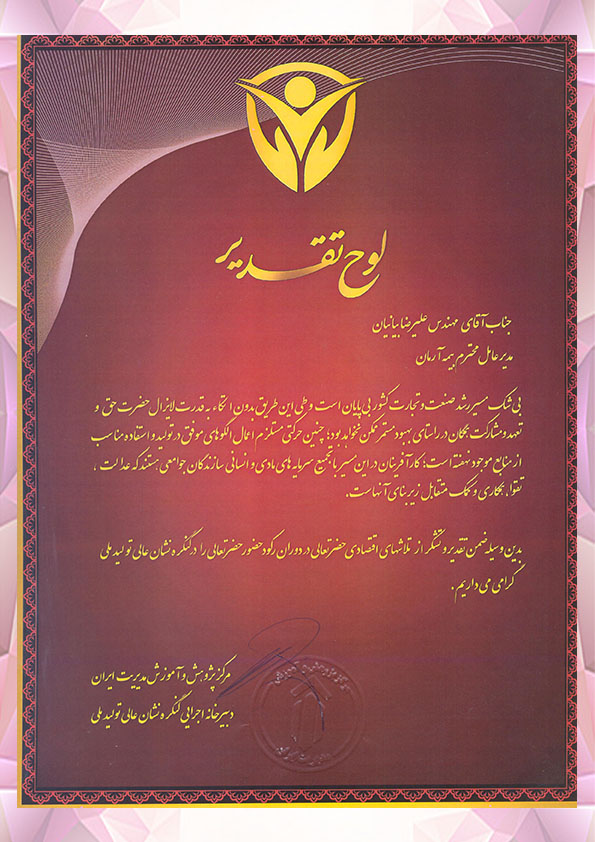 لوح تقدیر مرکز پژوهش و آموزش مدیریت ایران